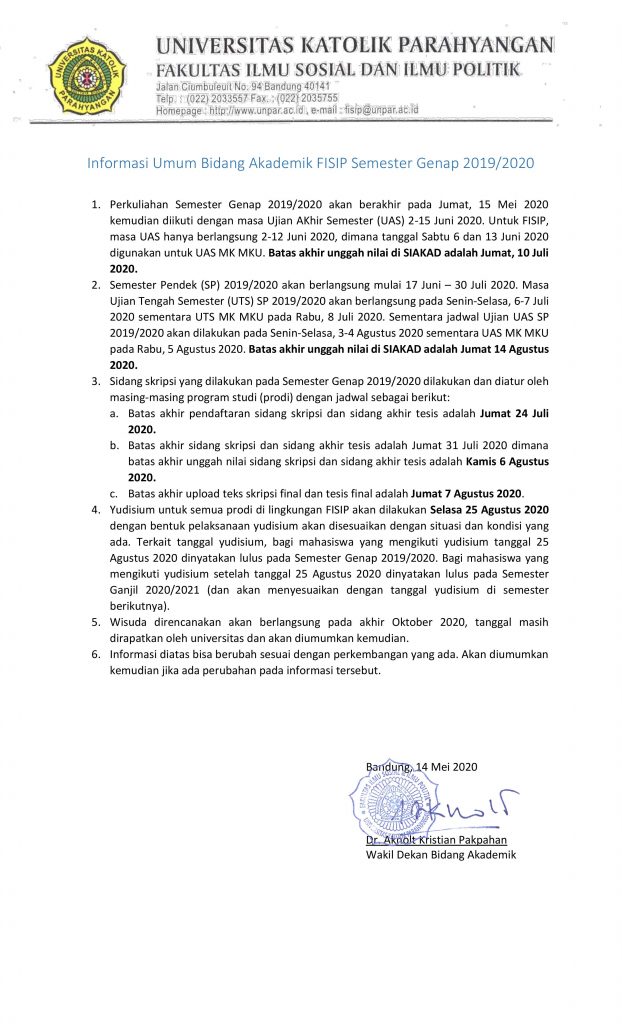 Informasi Umum Bidang Akademik FISIP Semester Genap 2019/2020 (Revisi 29 Juli 2020) Pages: 1 2 Akademik Fisip Unpar Informasi 2020-05-15 iwan